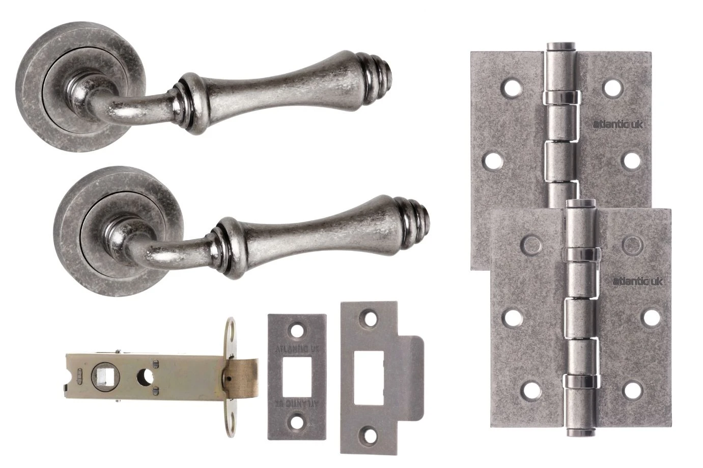 This Durham Door Lever Value Pack comes in a timeless Distressed Silver, perfect for the more traditional style doors in our collection. This value pack includes 2 x handles, a door latch, striking plates, and a pair of hinges, all in the matching Distressed Silver finish. Manufactured to last, you will feel the quality of the product by the weight. The pack will include all the required fixings to install these products to your door.