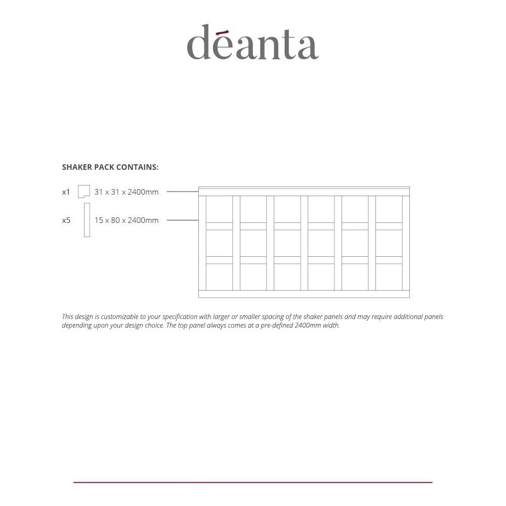 This design is extremely adaptable, allowing you to make changes to best fit your individual needs. You can customize the space between each shaker panel to be whatever size you desire, with the top panel coming at 2400mm width as standard. There may be occasions where additional panels are needed in order to complete your desired look – making it truly one of a kind. As this is customizable, make sure you take the chance to perfectly decorate your home or other areas with your own design