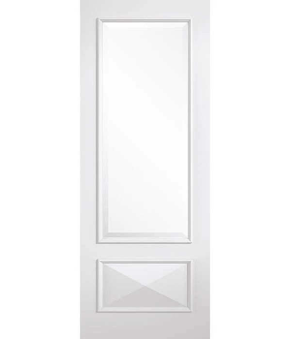 This stunning, high quality new Knightsbridge White Primed Glazed Internal Door is one of our greatest additions to the white primed door collection. The Knightsbridge door collection has every different option you would want in a white primed door, so you can mix and match the doors throughout your home depending on your requirements from room to room. This variation is the impressive glazed Knightsbridge internal door, allowing you to introduce more light into certain rooms due to the large glazed panel that covers roughly 70% of the door. The glazed panel boasts a raised dramatic bevel adding to the traditional style of this two panel door. The door also features a horizontal rectangular panel across the bottom of the door which displays a pyramid or ‘cricket bat’ shaped peak in the panel. This is framed by a raised decorative beading to bring out even more classic features. Whilst this door is predominantly traditional in design, the smaller details such as angular shapes in the panels and glass mean that it could also work in a more contemporary styled home.