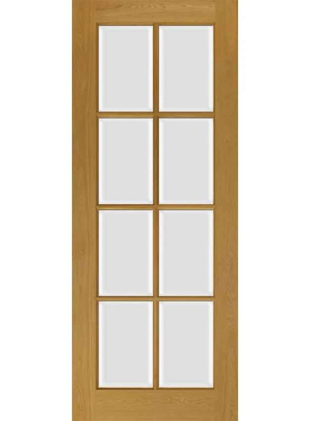 Featuring eight bevelled glazed panes, made from toughened safety glass which is bevelled to one side. They are separated by wonderfully sculpted solid Oak beading. This is offset by a rectangular Oak frame which features a solid wood core.