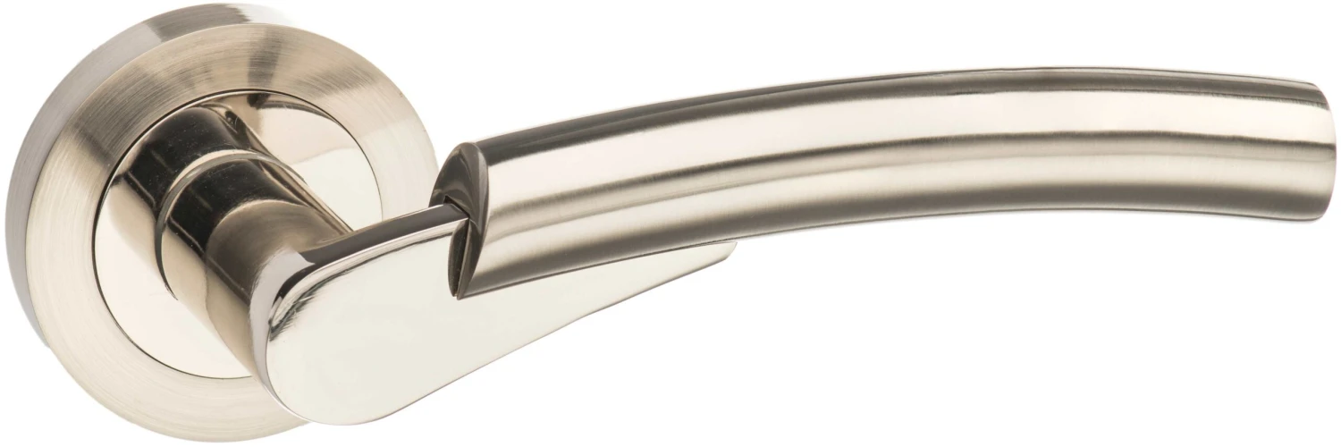 Both the rose and the lever section have the dual finish combining satin nickel with polished nickel. Mix and match with either finish for your hinges. The Messina style has an upward sloping lever with a tubular grip that is clasped onto the handle.