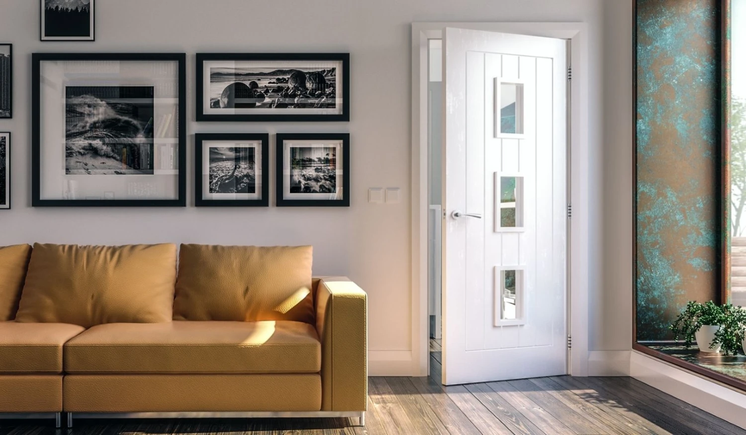 This white primed internal door stands out with its three integrated clear glazed panels. It’s contemporary, understated design allows natural light to flow freely, effectively connecting your spaces while enhancing your home’s aesthetic appeal. Whether you’re renovating or constructing afresh, this door type will align with your home’s scheme, promoting a welcoming and cosy atmosphere.