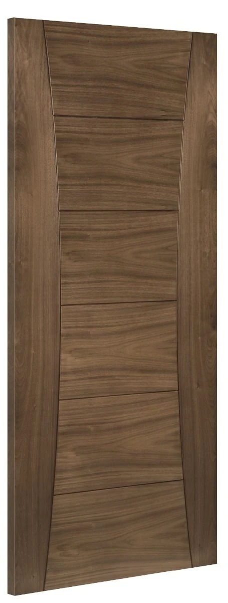 This modernly designed Pamplona pre-finished interior walnut door comes in a unique design that makes it perfect for modern and contemporary styled homes. The walnut door is well curved at the edges, giving it a unique design that is easily identifiable. The contrast between the vertical grain on the curved panels against the horizontal grain in the central panels mean that the door is a natural statement piece that is sure to gain attention and compliment it’s surroundings.