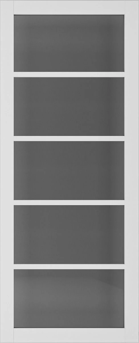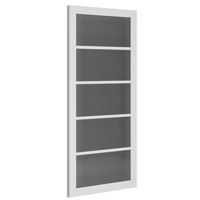 The Urban Collection from Deanta has landed! A brand new full range of 24 interior doors in various styles and finishes including a clear glazed door and a solid door in 4 different styles and 2 different finishes. This product, the Shoreditch White Primed 5 Panel Tinted Glazed internal door, is a beautiful example of the perfect balance between glazed and solid. With a relatively dark tint on the glass, this product is a great translucent option for rooms that need a bit of extra light without completely removing all privacy. A modern glass door such as this is a perfect solution for a bathroom door, allowing light to flow in whilst maintaining a level of privacy. Consisting of 5 toughened glass panels, aligned vertically, the tint on these glass panels create a very monochrome contrast between the dark tint and white primed timber. The tinted glass diffuses light into a beautifully soft glow, creating a lovely ambience within the home.