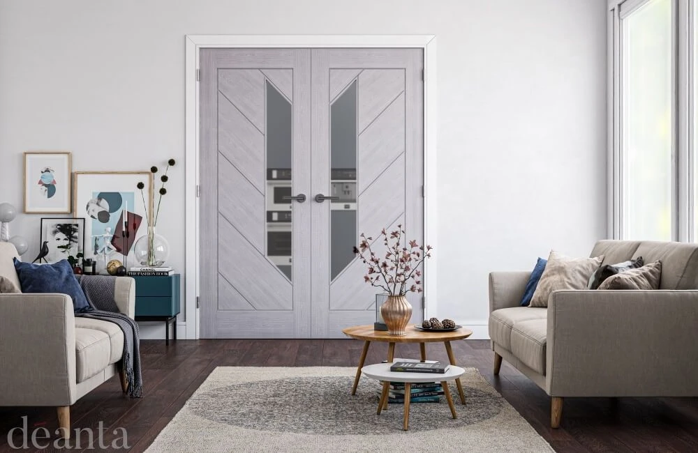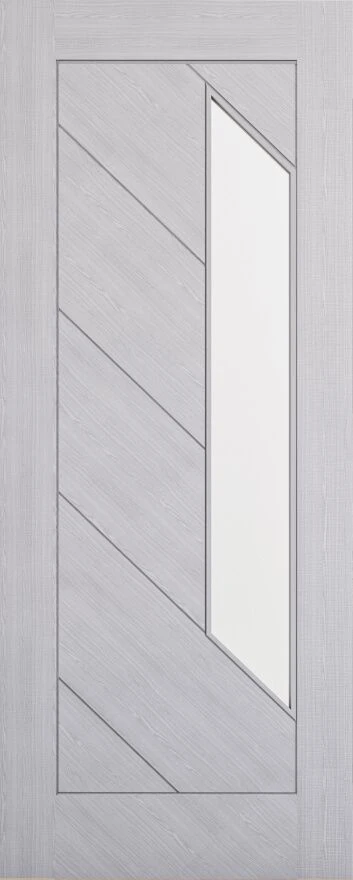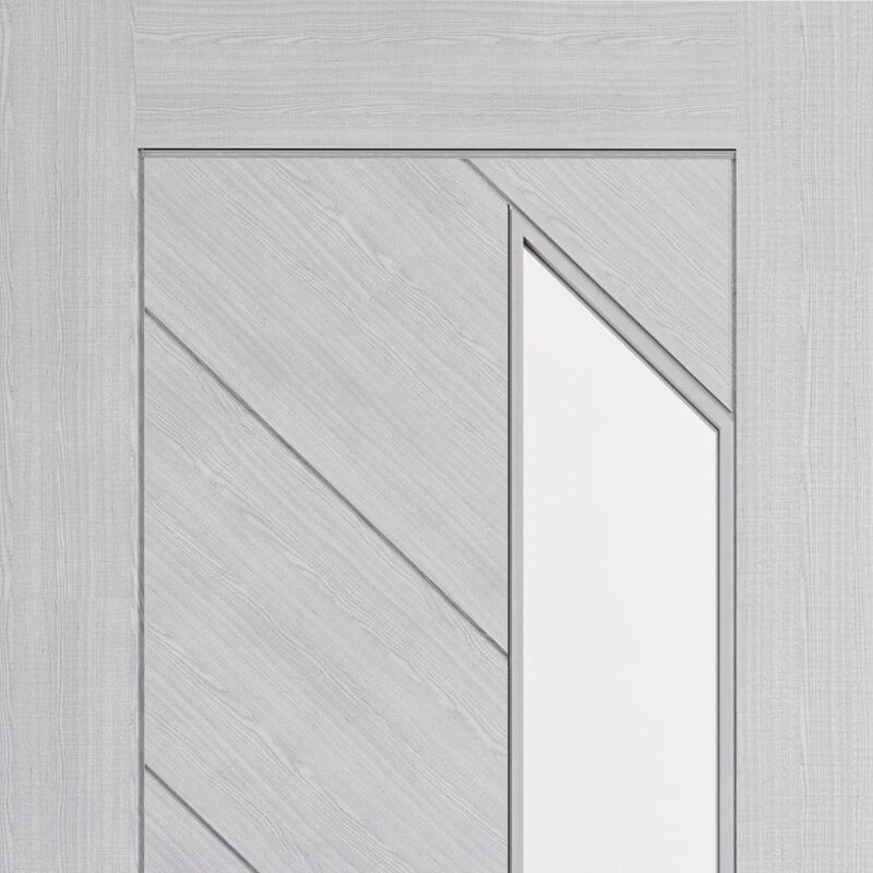 The Torino Glazed Prefinished Light Grey Ash Fire Door has a unique contemporary style that you won’t find in many internal doors. Surrounded by a thick frame the central section is divided up into smaller diagonal panels with a vertical parallelogram complete with pre-fitted FD30 rated fire glass. Each of the inlaid panels are on a diagonal slope with grooves providing a slightly darker contrast around each of the panels.
