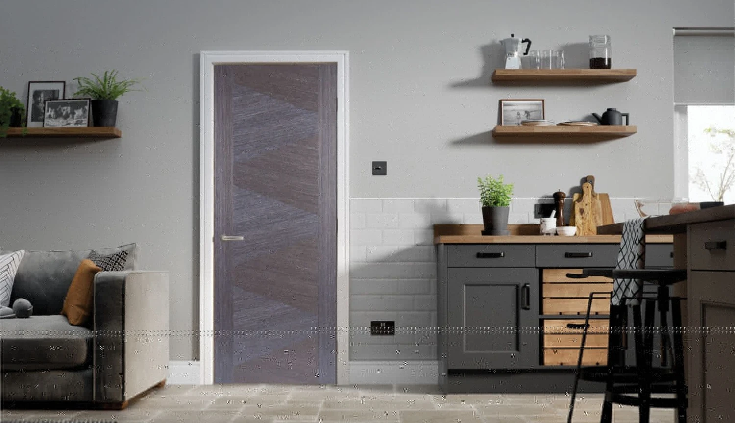 The Zeus Prefinished Ash Grey Internal Door is modern style which is a welcome and popular addition to our fast growing grey door range. The contemporary triangular design will transform your door into a statement piece within your interior decor and guaranteed to be an attention grabbing feature. The dark grey ash grain pattern cleverly contrasts against each other in the diagonal design that brings a modern balance to the internal door.